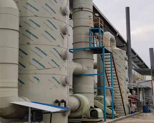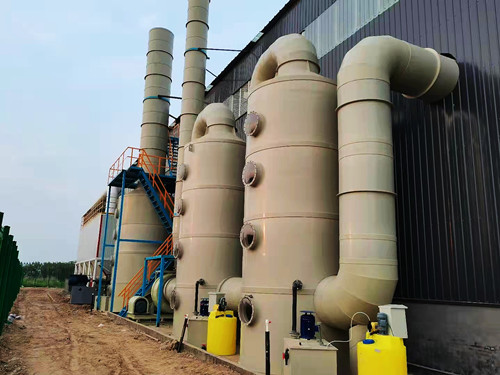 在廢氣處理工程中必不可少的設(shè)備有兩種,一種是通風(fēng)設(shè)備,另一種是廢氣凈化設(shè)備。而通風(fēng)設(shè)備就是本公司主營的玻璃鋼離心風(fēng)機,廢氣凈化設(shè)備則根據(jù)具體的需求進行選擇,如下圖中的PP凈化塔就是比較常見的廢氣凈化裝置。除了凈化塔之外,活性炭吸附塔、等離子分解裝置、除臭裝置等都是用來凈化廢氣的。在使用時玻璃鋼離心風(fēng)機通過管道與這些設(shè)備連接在一起。下圖是玻璃鋼離心風(fēng)機與廢氣處理裝置的使用圖展示。